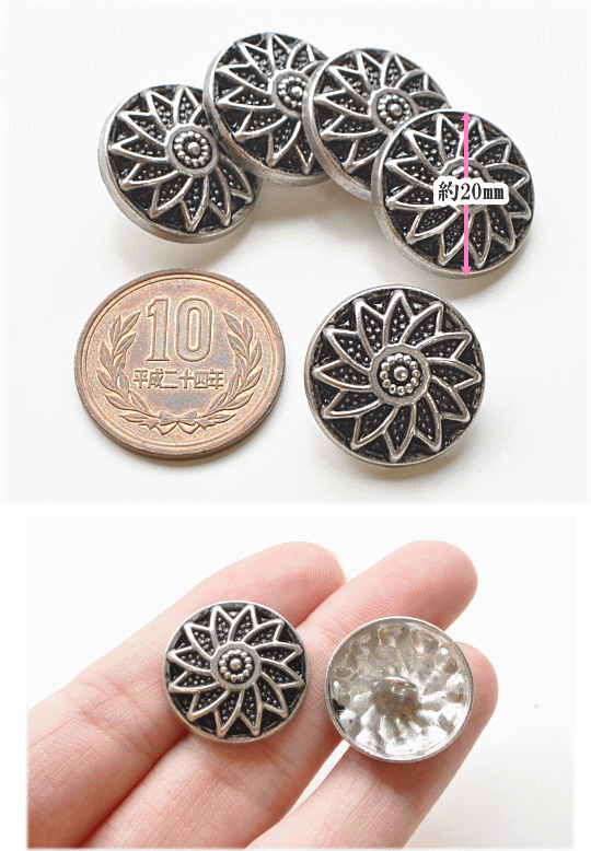 (例:1Mを5枚に分けて、1M・2Mを1枚ずつ、など)コンチョボタン 5個 20mm幅 アンティーク調のシックでおしゃれなボタン。